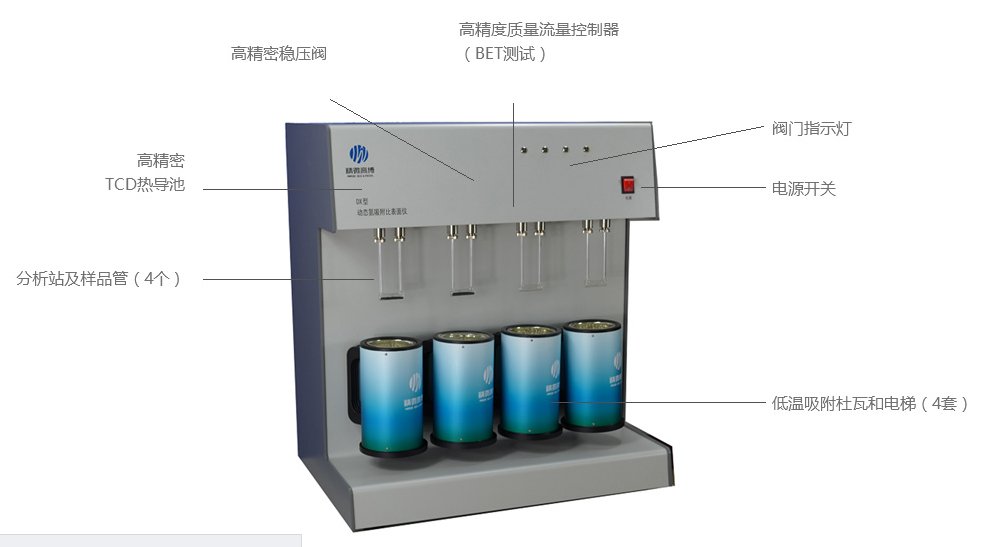 JW-DX型动态吸附比表面测定仪,JW发明专利,创新的结构,每个样品单独吸附,互不干扰,吸附峰尖锐,灵敏度大大提高,通过吸附峰直接对比得到比表面,测试准确、稳定,比表面下限降低一个数量级,非常适合电池正负极材料尤其是石墨等小比表面材料的检测。